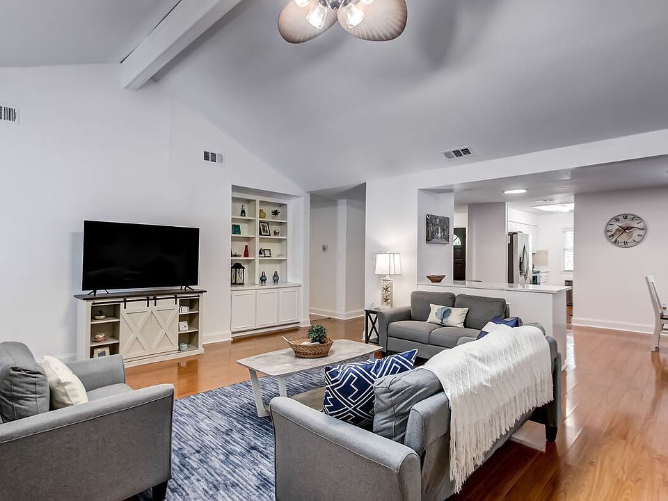 Fully furnished 1-month + rental available with fully fenced in back yard and attached garage for parking. This beautiful 3Bedroom/2 Bathroom unit comes with a fully stocked kitchen and Washer/Dryer in unit, to provide everything you need!