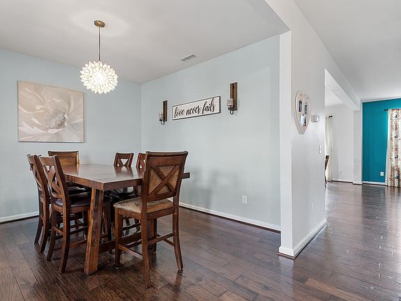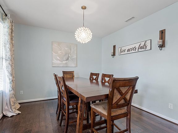 Welcome to this beautiful partial brick 4-bedroom home located in the vibrant community of Knightdale, NC. This picture-perfect home features a stunning front porch and wood floors throughout most of the living area, adding a touch of warmth and elegance. With an open floor plan and numerous upgrades, this home offers a spacious & comfortable living space. The large eat-in kitchen is a chef's delight, featuring ample counter space, dual sinks, & modern appliances. The master suite boasts dual sinks, a large soaking tub, and a generous walk-in closet, providing a luxurious retreat. Step outside to the fenced backyard, complete w/ a playset & plenty of room to run & play. The upstairs area includes a spacious sitting/TV area, convenient laundry room, separate large formal dining room offers versatility & could also be used as a home office, morning room or bar catering to your specific needs & preferences. The home features a large master bedroom & secondary bedrooms, all w/ wood flooring and ceiling fans for added comfort. Walk to the park and enjoy the community pool & enjoy this vibrant atmosphere!