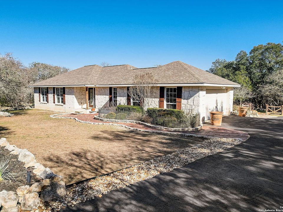 Stunning 1-Story Texas Hill Country home in the community of River Mountain Ranch sits on a sprawling 3.25 acres! This property provides the privacy you are looking for, with beautiful mature trees and plentiful wildlife. A tiered rock garden and flower beds greet you out front, and add a charming touch to the home. Inside, an open floorplan hosts neutral tones, beautiful wood and stained concrete flooring, high ceilings, a spacious living room with backyard views, kitchen and dining nook with French Doors and outdoor access. The primary suite includes a bath with soaking tub and walk-in shower, and the secondary bedrooms are well-sized. Relax or entertain in the backyard, with a covered and open patio, built-in propane grill, and fire pit, the perfect place for enjoying big Texas sunsets! The nearby Guadalupe River allows for many outdoor activities, including fishing and floating. There are so many updates to the home, which include a new well shed and one of the largest water tanks in the community, new large storage building (2022), new HVAC and water softener system (2022), refinished concrete floors (2019) new garage door opener with keypad (2022) and insulation to garage door, new water heater (2024), and asphalt paved driveway from main road to house installed in 2021 and resealed yearly. This could be your dream private retreat, book your personal tour today!