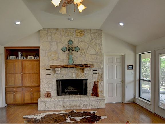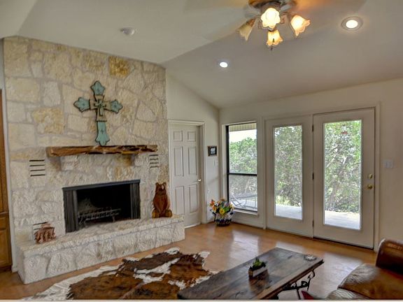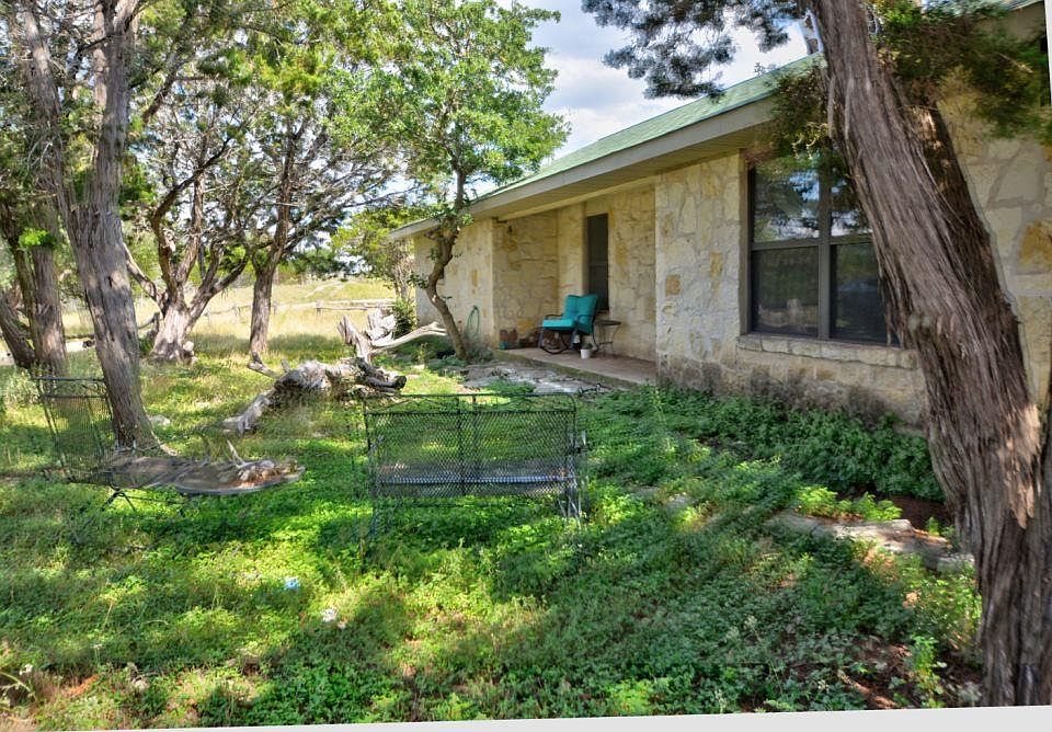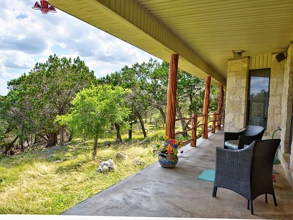 Exceptional View! As soon as you walk into this Ranch Style home your greeted with a VIEW! Plenty of room for entertaining in the living room which features a large stone fireplace, wet bar & custom shelving. Off the living area is the covered back porch where you will spend time enjoying the exceptional Hill Country view! Continue through to the roomy well appointed kitchen with breakfast area. This home also features high ceilings, a separate formal dining room, split bedrooms & laundry room. Priced to sell AS-IS! This is a jewel in the making! Come see what this 8.77 acres can be with your vision and care to make it yours! Buyer to verify square footage, land/lot size, and age of home. All information deemed reliable but not guaranteed.