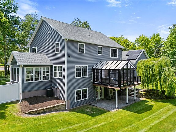 Stunning and spacious Colonial, built in 2007, set on a rare double lot totaling 4.13 acres—subdividable for future potential! This 4-bedroom, 2.5-bathroom home is rich with character, quality finishes, and energy-efficient upgrades. Enter through the mature, custom-designed gardens into a formal mudroom with adjacent half bath and full laundry room. The kitchen impresses with an oversized island, large walk-in pantry, and seamless flow into the living room with pellet stove. Just off the living area, enjoy a beautiful four-season sunroom with cathedral ceilings and eye-catching tile inlay.