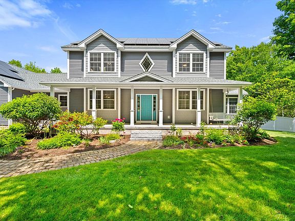 Major upgrades & highlighted features include two solar arrays installed by ReVision Energy, central A/C, new roof shingles in 2024, EV charging station, heated 3-car garage, fenced backyard, 8-zone irrigation system, and a peaceful front porch with hanging seat to take it all in—everything you need to make this your forever home.