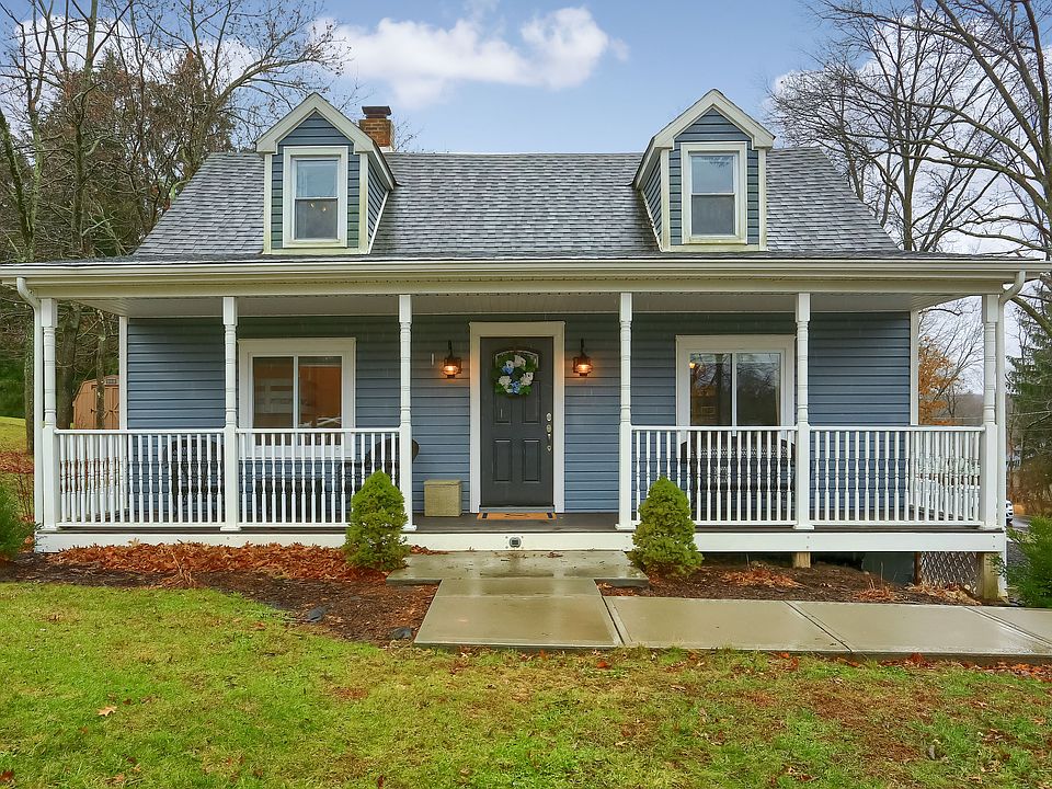 Welcome to this charming home tucked on a wooded homesite with updates galore. With a newer roof, siding, and custom landscaping the curb appeal is sure to impress as guests are greeted on the covered front porch. Step inside and notice the exquisite staircase with wrought iron balusters and judges panel detailing to include storage. Host the next family gathering in the open and airy dining room with sun filled windows and neutral tones. Create meals in the well-equipped kitchen boasting stainless steel appliances and abundant white cabinetry with a built-in wine rack. Enjoy a quick bite to eat at the spacious island with casual seating. Endless counter space allows for easy meal prep and clean up. French doors open to the rear deck and yard. After dinner, move to the bright and generously sized family room featuring a possible fireplace, neutral tones and French door access to the rear deck and patio. A main level guest bedroom is large and shares an updated hall bath boasting a modern marble topped vanity, tile flooring, stylish lighting and a tiled tub/shower combo with a window. The second floor has an expansive master bedroom with ample storage, neutral paint tones, and a custom ceiling. A spacious guest bedroom is bright and airy. The spa-like hall bath includes modern updates such as a tile shower and a granite topped vanity with modern lighting and storage. The finished walk out lower level has neutral paint tones and a generously sized laundry room with tile flooring, wainscoting, a generously sized folding counter, deep sink and a half bath. When the weather warms up, relax on the expansive rear deck or invite friends and family to enjoy games in the level yard.
