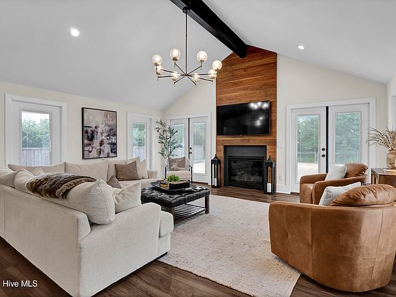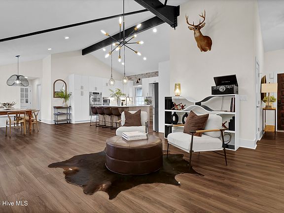 Nestled in the heart of Windemere, this fully renovated brick ranch is a true showstopper! Every detail has been meticulously crafted to perfection. A stunning addition creates a spacious living room, featuring a cozy gas fireplace with a custom walnut chimney detail, complemented by an abundance of windows and doors that flood the space with natural light. The vaulted ceilings with exposed wood beams stretch across the living room, dining area, and kitchen, forming a seamless open concept ideal for entertaining. A built-in bar with a wine cooler in the living area adds a touch of sophistication, perfect for hosting gatherings or relaxing evenings at home. The kitchen is a masterpiece in itself, boasting a custom butler's pantry, an oversized island, and built-in bench seating. The master suite offers a serene retreat with vaulted ceilings, a walk-in closet, and a luxurious en-suite bathroom complete with dual vanities, a water closet, and an impressive walk-in shower. Down the hall, two charming guest bedrooms share a beautifully updated full bath. The garage provides ample storage for your vehicles and beach gear, while the expansive, front and backyard offer endless opportunities—all with no HOA! Conveniently located near Mayfaire and Wrightsville Beach, this home perfectly balances style, comfort, and accessibility.