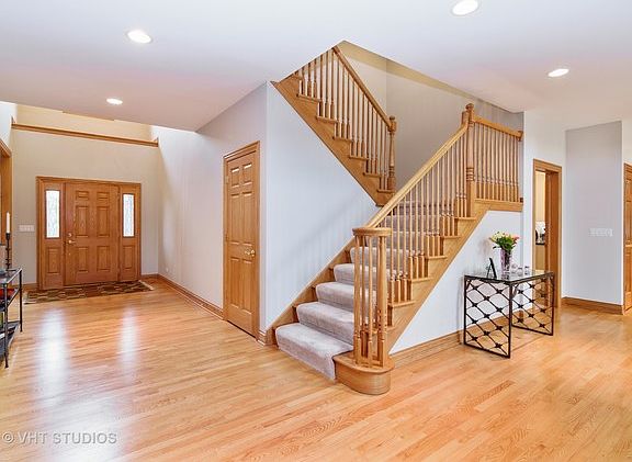Luxurious high end custom brick home with 4 large bedrooms, 3.5 baths, a loft, first floor office/den+3 car garage. Modern open gourmet kitchen with stainless appliances, granite counters, marble back splash, 42" hardwood cabinets, breakfast bar/island, pantry, and separate table area. Grand two story foyer entry with beautiful hardwood floors. Includes two master suites. Main master has a tray ceiling, two California walk in closets, ceiling fan, private bath, glass shower, whirlpool tub, double sinks, and marble counters. 2nd master has a separate sitting area and private bath. Two story great room with a gas log stone fireplace. Large patio with gas hook up for grilling. Huge formal dining room. Professionally landscaped. 9ft ceilings in basement with rough in. 1st floor laundry/mud room with front load washer/dryer. Dual heat/AC. Award winning schools: Fremd High, Plum Grove and Pleasant Hill. Near train, highways, shopping, and parks. Freshly painted light grey. Pella windows.