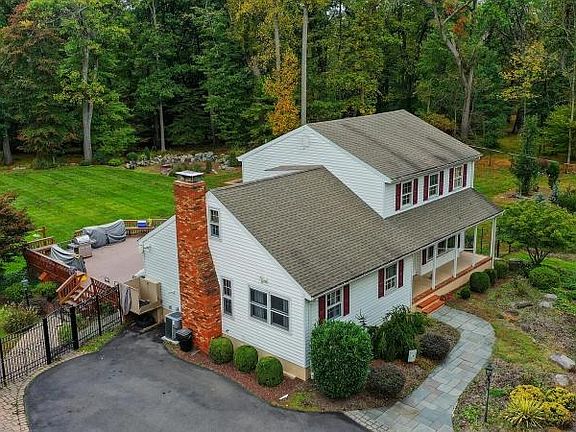 Well maintained 4 Bedroom Colonial home on a park-like 3+ acre lot. A generously sized Family Room with wood burning stove, 3 Full Bathrooms and bright Sunroom with Coffee Station, corian countertops, heated flooring, cabinets, ceiling fan, recessed lighting, and sliders to deck make this home a unique one of a kind! The Custom Kitchen has oak cabinets, double pantry, Stainless Steel appliances, double oven, electric cooktop, buffet with bar sink, large center island, and ceramic tile flooring. All bedrooms have hardwood flooring. Partially floored attic can be used for storage. Newer attic fan. Walk-out finished Basement with Full Bathroom. Detached 2 Car Garage with loft storage. The secluded exterior has a deck, bluestone patio, boulder fire pit area, and garden with a 6' deer fence. Xfinity cameras included.