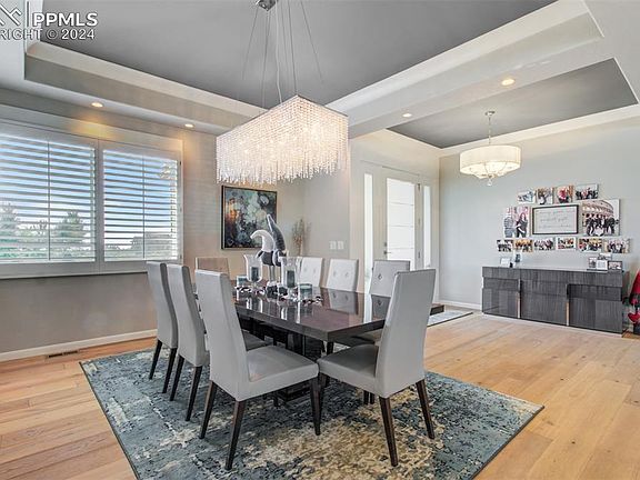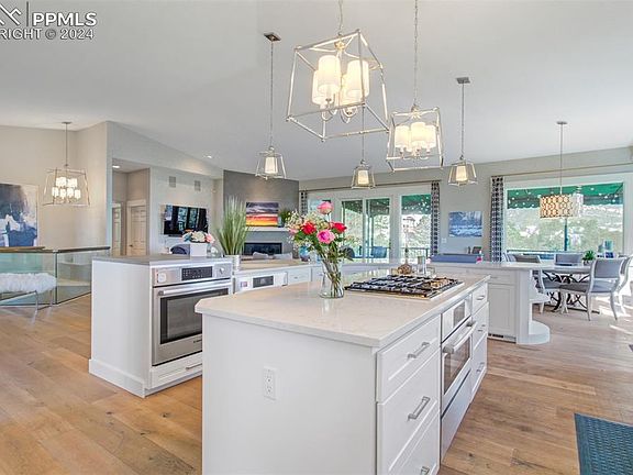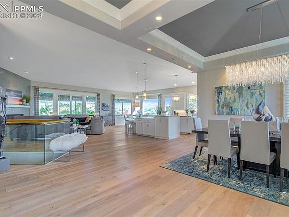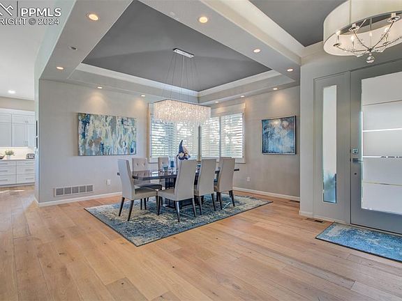 Sophisticated Elegance is illustrated in this Top of Skyway Home located in Award Winning District 12! This 4 Bedroom, 3 bathroom, 3-car attached garage, Stucco Home is adorned with Elevated Classic Finishes..As you enter you are struck with Light pouring in..Oak Flooring with an Open Floor Plan, The Formal Dining Room has Shutters and a Coffered Ceiling, then comes the Gourmet Kitchen fit for a chef with its Quartz Counter Tops, oversized Central Island, Plenty of Bar Style Seating for Entertaining, Lots of White Custom Cabinetry, with Stainless Steel Bosch Appliances, a walk-in Pantry, Custom Light Fixtures & another Dining Area. The Living Room has a Porcelain Mantle to the Gas Fireplace & a walk out to the Wrap Around Deck with even better Views of the City, Mountains and Garden of the Gods. The Primary Bedroom on the Main Level boosts Pristine French Doors leading to the Wrap Around Deck, a dual-sided Fireplace shared with the En Suite 5 Piece Primary Bathroom complete w a Separate Shower with Custom Glass Doors, a Soaking Tub & a Large Walk In Closet. The Main Level also has a 3/4 Bath, Laundry Room w Sink just off the Garage & a Second Bedroom. The Lower Level of the home has lots of Windows making it Bright & Cheery, Complete w an Expansive Family Room adorned with custom tile gas fireplace, Luxury Vinyl Flooring, Game Space w a Pool Table, 2 More Bedrooms Both w Custom Barn Doors sharing a lovely 3/4 bathroom! Bedroom 4 also has a bonus room attached..perfect for an office…Lastly the Utility/Storage Room which could be made into another bedroom/bathroom if needed! From the Family Room walk out to a Trek Deck w Custom Railings, roll up shades and has a Bullfrog Hot Tub, see the Dog Run complete w Astro Turf and electric doggy door! Don't miss the opportunity to make this exquisite property your own – schedule a showing today!