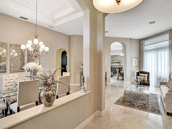This exceptional better than a model home is a 5 bed & 3 bath, is an entertainers dream. New roof (2023), New AC (2024), Water Heater (2021), Dishwasher (2024), Partial Hurricane Impact doors & accordion shutters. Well maintained home boasts marble floors throughout. Kitchen features dark cabinets w/ quartz countertops. The Cabana Bath includes a home steam room. Closet organizers throughout, offering max storage. Backyard features a fully equipped summer kitchen, surround sound Sonos system inside & outside. Custom remote-controlled blinds & window treatments add both convenience and style, Newer Awning installed in back yard to help you sit in the shade and enjoy the view. Most decked out Tiki Hut with artificial Thatch to give you years of worry free entertainment.