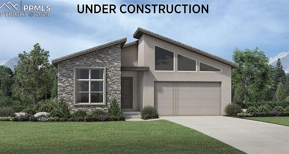 Our Pinon Mid Century Modern rancher is loaded with curb appeal. Stucco and stone exterior with included full landscaping for easy maintenance. Main level feels airy and spacious from the moment you enter with 10' ceilings and 8' doors. Primary bedroom with bath plus dual walk-in closets; second main level bedroom with adjacent full bath, study with French Doors, powder bath & laundry in addition to Great Room with 12' stacking sliders to expanded deck. Great Room also includes gas fireplace with Eldorado Whitebark Cliffstone surround & mantel. Kitchen features upgraded KitchenAid appliances & quartz countertops. Spacious dining noo with optional nook windows floods the area with morning light. Finished 9' basement includes spacious family room, two additional bedrooms, full bath plus powder bath & unfinished storage. 3-car tandem garage with 4’ expansion.