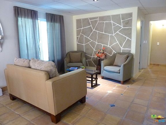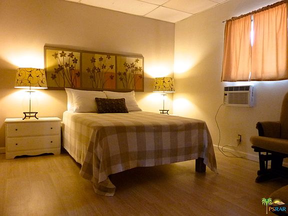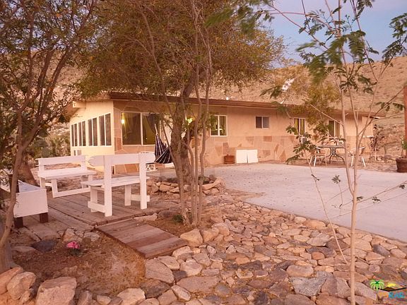 This adorable Ranchito has charming curb appeal up on a hill. There is a beautiful seating area near the front door and a fire pit area down some steps that over look the desert mountain area. This 3 bedroom 2 bath property is nestled in the Indio Hills area off Dillon. Wood flooring in the bedrooms and baths compliments the family and dining area. There is a new concrete drive leading up to the front door. The landscape has been manicured and tended to with care. This is the property to call your next home or a great vacation rental. We welcome all first time home buyers.