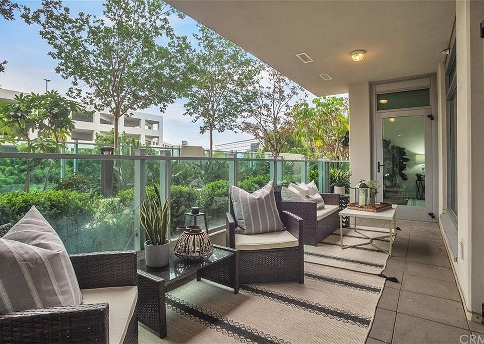 The Marquee at Park Place welcomes you home to your urban oasis. This desirable Plan C model offers a master bedroom with a luxurious ensuite bathroom. On the opposite side of the home is a spacious second bedroom. Each bedroom has direct access to the enclosed patio lined with lush trees for added privacy. A large den near the main entry creates the perfect work-from-home office or personal exercise studio. You'll love entertaining guests in a spacious kitchen that comes complete with a NEW large farmhouse sink, granite countertops, and state of the art stainless steel appliances. A stacked washer and dryer unit is included in the home for your convenience. Centralized A/C and heating throughout the home is dual zoned with thermostats located in both the living room and the master bedroom. All rooms are equipped with phone, cable, and high-speed internet connections. This upscale community includes 5 star amenities for you to enjoy, including a fitness center, pool, business center, billiards, clubhouse, and theater. The community also has a 24 hour guard gated entry for added security and peace of mind. Discover a variety of shopping, entertainment, and leisurely activities that are just a quick walk or drive away. This home is centrally located near major freeways, casual and fine dining restaurants, shops, hiking trails, UC Irvine, the Irvine business district, Fashion Island, John Wayne Airport, and so much more!