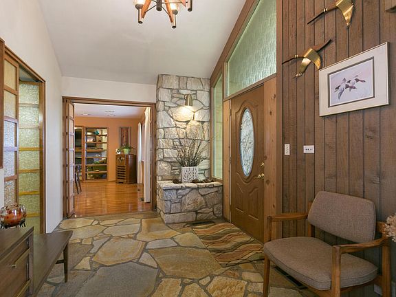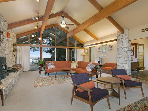 Capsulated and updated, mid century magic never looked better...through the large entry doors, guests are treated to the feeling of an era of true hosting. Large scale living and entertaining spaces are accented with walls of floor to ceiling windows, and soaring beamed ceilings rooted in rock and wood detailing, Period details, including extensive wood work and midcentury fixtures, have been painstakingly restored and preserved to maintain the homes architecture.The updated and open kitchen features modern materials which transition seamlessly between the formal and informal living spaces.