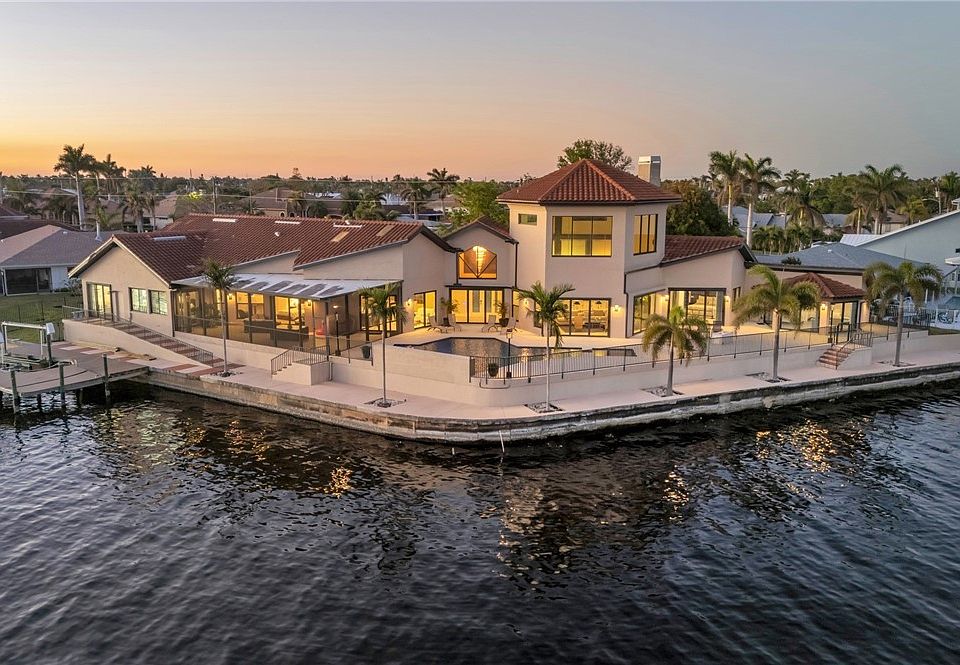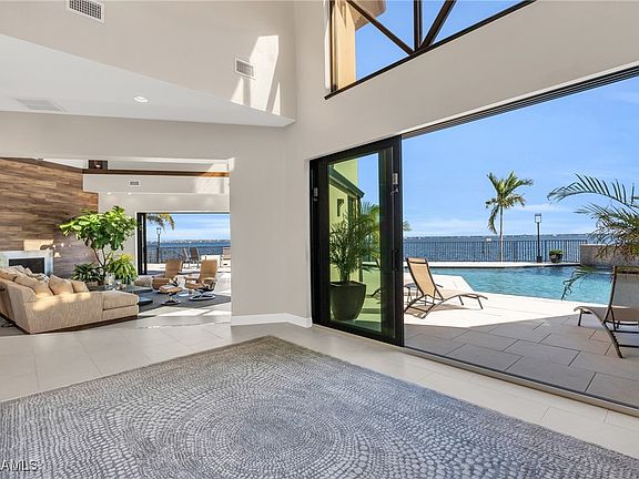 **One of Cape Coral's Most Exceptional Residences** Seize this unparalleled opportunity to reside in a home of remarkable distinction, situated directly along the Caloosahatchee River with 265 feet of waterfront. This property merges three lots to form an expansive compound of approximately .34 acres, encompassing 4,156 square feet of opulent living space. The impressive 40-foot cathedral ceiling in the living room serves as a breathtaking focal point that must be experienced in person to fully appreciate its beauty. The living room also features exquisite solid wood accents and a cozy wood-burning fireplace, adding to its charm. Every room in this magnificent residence offers captivating river views and direct access to the patio, ideal for al fresco dining with sweeping vistas of the Caloosahatchee River. This home artfully blends character with refined design, showcasing four bedrooms (including two master suites), a den, three full bathrooms, and ample living and entertaining areas, all thoughtfully designed for grand-scale gatherings. The gourmet kitchen is a chef's paradise, equipped with top-tier Wolf appliances, custom cabinetry, and a spacious island that is perfect for both culinary creations and socializing. Whether hosting an elegant dinner party or enjoying a quiet evening at home, this space seamlessly combines style and practicality. With its unmatched location, distinctive design, and exceptional amenities, this residence stands as a true icon in Southwest Florida real estate. This is a once-in-a-lifetime property not to be missed.