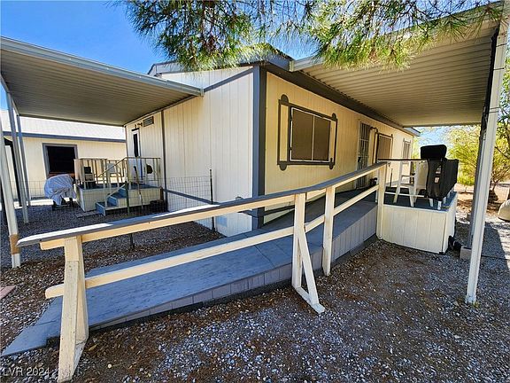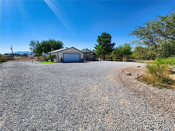 A must see, 3 bedroom 2 bath home located on approximently 1 acre. Has a 2 gar garage. It is surrounded by shade trees and beautiful scenic views of Mount Charleston. Primary bedroom & guest bedrooms are seperate. There is a decorative glass stain window seperating kitchen & living room. It is surrounded by beautiful landscaping with trees and a green space out front and in back. The yard is fully fenced with access to 2 gates. Zoned for horses. R V Accessible. There is a ramp leading to the front patio. LED Security lights have been placed in front & back of the home & garage.