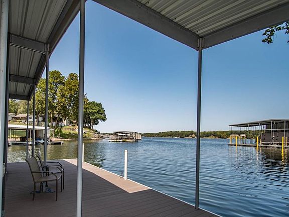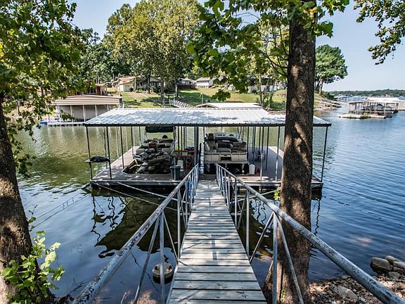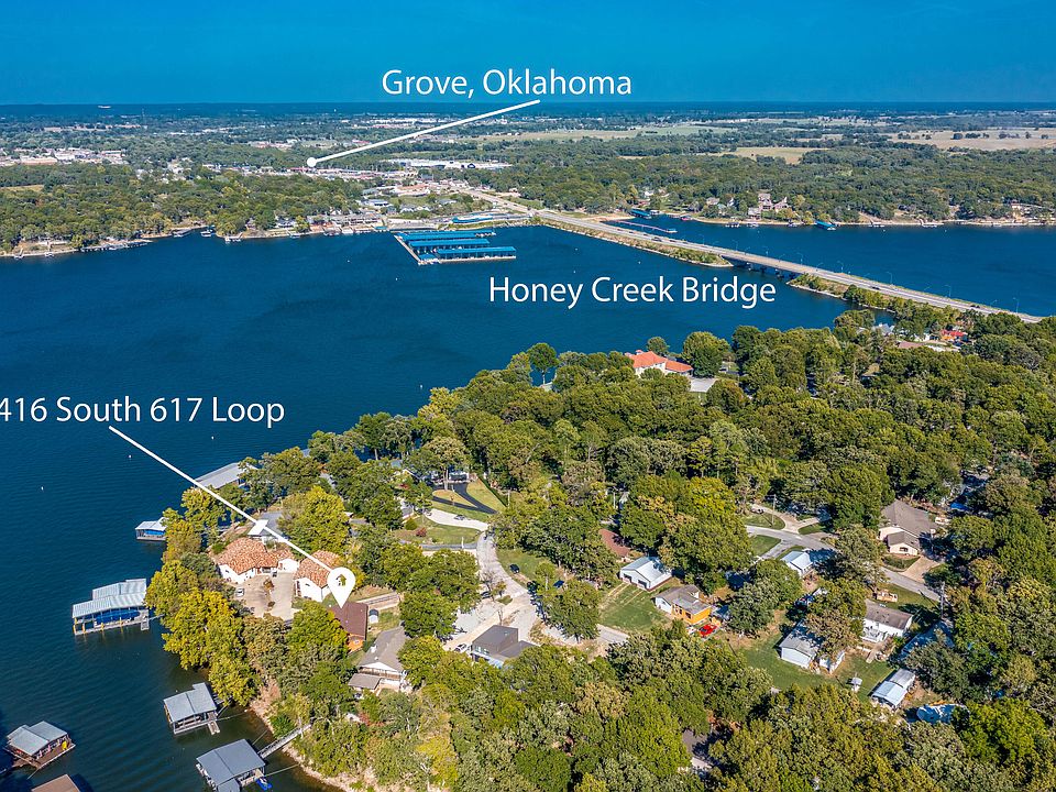 Lakefront cabin on Honey creek, super 2 slip boat dock, 28' slips, gentle lake access, seawall, level back yard to boat dock walkway. Great home for outdoor living, multi level concrete patio, lg wood deck, with super Grand Lake views of Honey Creek. Home was totally remodeled in 2001, beautiful teak floors set the stage for this open floor plan lake cabin. Huge living Dining combo room, New exotic granite counter tops & back splash in kitchen, master suite on lower level, spacious master bath with tile shower, 2 guest bedrooms on main level with full bath between.