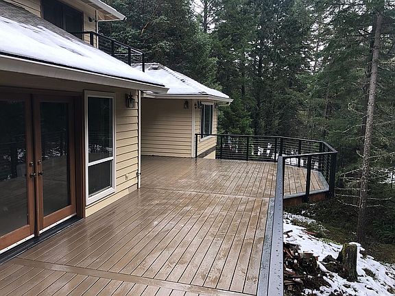 Stunning treed setting plus you can hear the sounds of Mystery Creek, which runs through the property. Great floor plan complete with a living room, 3 bedrooms and 2 baths, plus a large recreation room including a wet bar. Situated on just over 23 private acres with mature evergreens surrounding the home. The master suite has a large walk-in closet and private balcony over looking the creek. Large picture frame windows allow all the natural beauty from outside in. There are french doors leading from the bonus room to the newly refinished deck. Brand new roof, exterior paint were all completed this spring (2016). There is also a large 24 x 36 detached workshop on the property. Most of the land is hillside and treed though there is a small usable area near the workshop. A must see and only a 10 min drive from Talent!