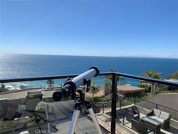 Nestled in the heart of Laguna Beach, this custom-built masterpiece offers an exquisite coastal living experience, with a total of 4,125 square feet and the convenience of an elevator for easy access between floors. Built in 2011, this contemporary home boasts breathtaking panoramic ocean views, just a short stroll from the beach—allowing you to indulge in both serene seclusion and vibrant suburban life. The sleek design flows seamlessly between indoor and outdoor spaces, featuring expansive decks off each level with sweeping views of the ocean, whitewater, Catalina Island, and city lights. The spacious kitchen, complete with a breakfast nook, overlooks the patio and features granite counters and stainless steel appliances, including a Wolf professional gas range oven with a center grill. A glass accordion-style patio door opens the living room up to the oversized deck, which is equipped with a retractable custom shade, a built-in fire pit and BBQ grill with a sink. As you explore this exceptional home, discover a secret hidden room reminiscent of something straight out of a James Bond movie—adding an intriguing element of surprise and luxury. The expansive primary suite features an inviting fireplace that creates a warm and cozy atmosphere and access to a large deck to soak up the sun. The large Primary Bathroom boasts a spacious stand-up shower and a jetted bathtub, perfect for unwinding after a long day. The primary suite also includes a large luxurious walk-in closet equipped with elegant custom cabinetry. The open-concept living areas are flooded with natural light, with ocean views from nearly every corner, creating a warm and inviting atmosphere. Spacious outdoor terraces provide the ideal setting for entertaining or relaxing in style. To enter into a state of tranquility, make your way to the upper level of the property where a relaxing spa awaits, offering panoramic 180-degree coastline and city light views—a peaceful retreat after a day spent enjoying the nearby beach. An outdoor shower is conveniently located near the spa and upper level bedrooms. Every detail of this residence exudes luxury and refinement, creating a lifestyle of unparalleled coastal elegance in the charming community of Laguna Beach.