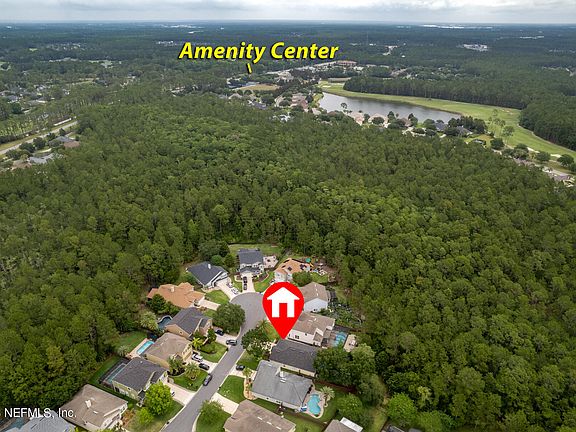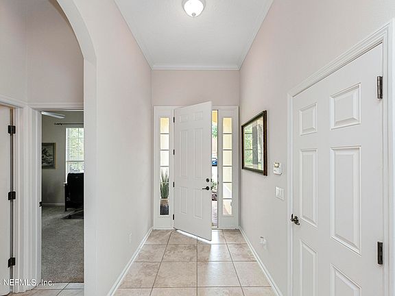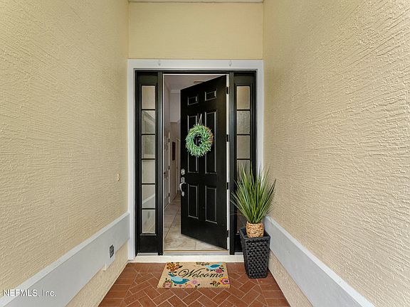 This SuperCute Yellow House is nestled in the highly sought-after South Hampton Golf & CC in St. Johns, with top-rated schools and picturesque tree-lined sidewalks. Situated in a quiet cul-de-sac, the home features a large backyard that backs up to the preserve, offering privacy and tranquility. The house has a new roof installed in 2022, newer AC, and hot water heater. The screened-in patio and newly pavered lanai are perfect for hummingbirds to visit. The house's charm is accentuated by 11 ft ceilings, new carpet, and LVP flooring throughout. The community offers a pool, lap swimming, playground, tennis courts, soccer field, and splash park. The house is only 30 minutes from the beach and a short drive from excellent grocery stores, shopping, and restaurants. Welcome Home!
