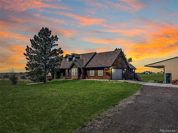 Are you tired of living on top of your neighbors in the burbs?! This Elbert County home sitting on 7+ acres of land offers you an amazing opportunity for country living with no dirt roads to contend with and yet your children get the benefit of attending Douglas County Schools: Pine Lane/Sierra Middle and Chaparral H.S.! This beautiful 6 bd 3 bath walkout ranch home is situated in a quiet community with acres of fenced pasture for your horses or other animals to roam! On the main floor you will find an open and inviting kitchen, vaulted ceilings in the living room, a main floor master bedroom which includes a large private bathroom and walk-in closet, dining room, 2 bedrooms, a full bathroom, and a laundry room with utility sink. Downstairs offers you 3 add'l bedrooms, a spacious family room, 1 baths, and an extra bonus room (your future hobby room or home office!). From the large deck on the west side of the house, you will have the daily pleasure of witnessing those amazing Colorado sunsets and seeing wildlife galore! Natural cedar siding on the house gives it a quaint rustic finish. Oversized 2-car garage is attached to the home, and the detached shop is big enough to hold up to four vehicles plus has an RV carport area with full hookups to power and sewer drainage! Also on the property is a loafing shed with power and water and nearby is a fenced chicken coop with chickens included if you choose. As one of the only homes in the area with natural gas instead of propane you won't need to worry about ordering propane refills on a regular basis! Maverix Broadband now offers area homeowners ultra-speed fiber optics that until recently were not available in this area! Current well permit plus well water rights to the Dawson Aquifer transfer with the property.