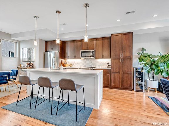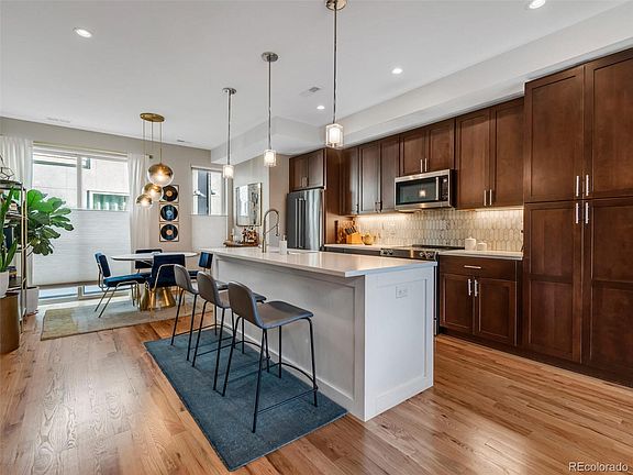 Why choose between a city or a mountain view when you can have both? Plus, walkability to two of Denver's most sought-after neighborhoods (Highlands Square and LoHi) for an eclectic mix of restaurants, summer fairs, and nightlife. This home was built in 2017 but lives like it's brand new. Walk into the main living area and be greeted with hardwood floors, open-concept living, and timeless finishes. The kitchen boasts shaker cabinets, quartz countertops, and plenty of cabinet space. The dining and living room both open to the kitchen, which is perfect for entertaining. Head upstairs, where you will find a primary suite with ample closet space and a primary bath with double sinks and a large walk-in shower. Between the bedrooms you will find the laundry closet, perfectly placed no going up and down the stairs. The second floor also features an office/bedroom with and en-suite bath. After a long day, relax and stargaze on the rooftop deck where you will find stunning city and mountain views. This rooftop deck also has privacy from both neighbors, which is one-of-a-kind in this type of build. The main-floor bath was converted to storage, but can easily be converted back to a bath. Downtown Denver is just a quick commute. Everything is at your fingertips. Don't miss the opportunity to call this special place home.