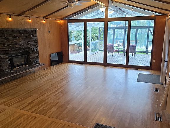The 2000 Sq ft living area is retro yet remodeled at the same time. Great living space, the huge living room with fireplace and vaulted ceilings faces the lake for a serene living environment. A large dining room with great natural light. The charming retro kitchen offers all the appliances, an eat in kitchen area and a nice pantry and laundry room - ready for the chef in the home to enjoy. There are 2 bedrooms on the main floor and a fully remodeled bathroom. The 2nd floor offers a bedroom and a large den, TV room or a guest area with panoramic lake views. The exterior deck is covered and huge for entertaining, BBQ's and outside living space for three seasons of use. No garage, but plenty of parking. Outdoor Amenities: Private sandy beach with zero-entry lake access, Dock and floating dock (able to be anchored 100ft from shore and used as a swimming platform), Large yard to the lake and a bonus top yard with space for volleyball, badminton, soccer/baseball practice (12-ft nets included), Quiet, scenic surroundings great for nature lovers and families (ducks, turtles, bald eagles and more). Don't miss this rare opportunity for lakefront living in a prime location! Message to schedule a showing today! This is a must see home. The home is light and bright and nicely remodeled. Please drive by the location, if you like the area please call our leasing team to schedule an appointment.