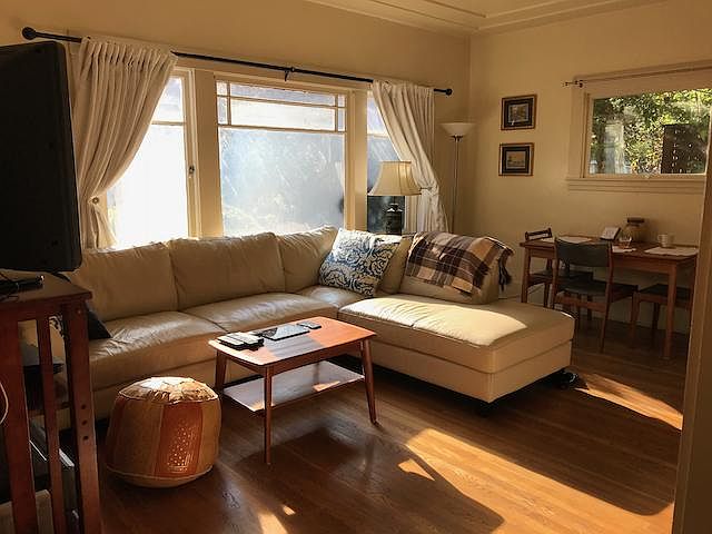 Extremely charming and sunny two-bedroom apartment in a 1923 fourplex Located in Elmwood District of Berkeley on the border with Rockridge High ceilings; hardwood floors; fireplace, large walk-in closet Renovated kitchen and bathroom Garage; free electric vehicle charger; additional storage area Free use of washer and dryer in the building A backyard sitting area Walk to Bart and other modes of public transportation to San Francisco, walk to Rockridge and Elmwood shops; walk to UC Berkeley Quiet building with only five other residents Location: College Ave. Between Woolsey & Alcatraz Owner pays for water and waste collection. Tenants are responsible for gas and electricity. 12 month lease No pets No smoking