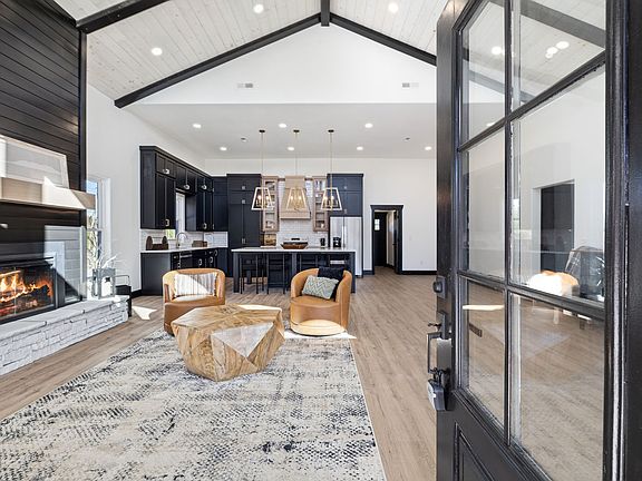 The open-concept floor plan showcases a vaulted wood ceiling, a large kitchen with granite countertops, a large hidden pantry, and abundant cabinet space—all flowing seamlessly into the living room. The living area features a floor-to-ceiling shiplap and stone fireplace, creating the perfect centerpiece for gatherings. Warm wood ceiling accents and durable laminate vinyl plank flooring add character and charm throughout.