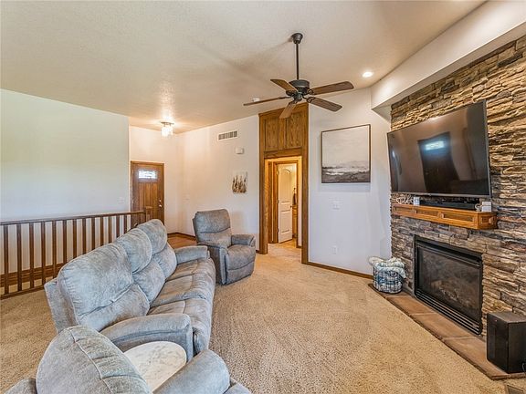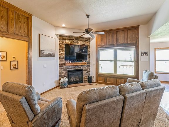 The views from this home are simply stunning. Enjoy quiet evenings on the covered patio or covered deck which overlook 20 acres of rolling green. The main level has an open floor plan with large windows and custom woodwork. The attached garage leads into the mudroom/laundry room. Kitchen with large corner pantry, eating area and spacious living room with corner fireplace. Large master suite has ensuite with big walk-in closet and lots of storage space. His and hers sinks. The main level also features a second bedroom and full bathroom. The basement has a bedroom with egress window, 3/4 bathroom, new carpet and lets of space for entertaining. Dayligth windows, LOTS of storage, and a BIG storm shelter. Quiet country living awaits! Call today for a private showing!