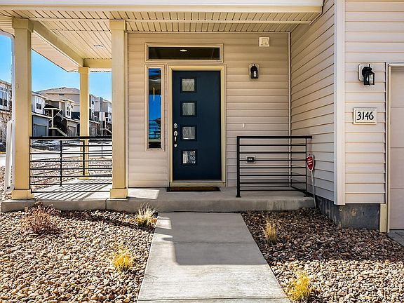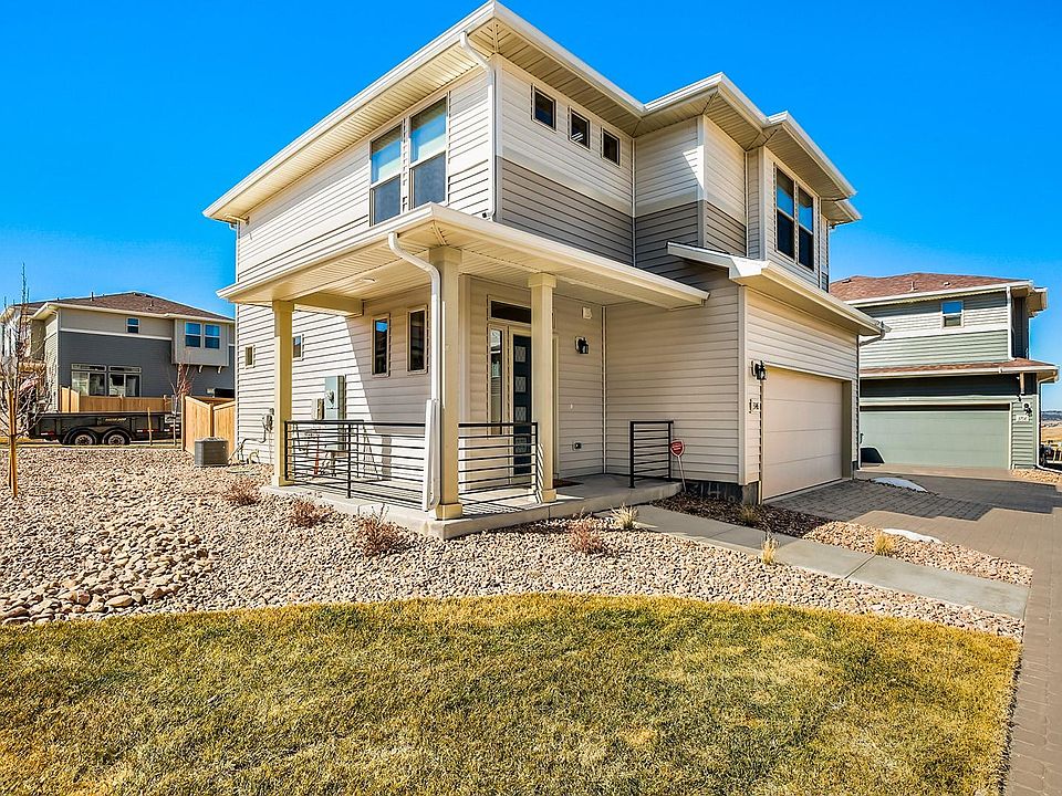 Gorgeous Carriage House home located just steps away from the community pool and clubhouse. Lovely curb appeal with a welcoming wrap around front porch. Stunning mountain views. Open concept layout with 9' trace ceilings, beautiful hardwood floors and brilliant natural light. Beautiful kitchen features granite slab counter tops, tile backsplash, Tahoe Hazelnut Glaze cabinetry, GE stainless steel appliances and a large island with breakfast bar, perfect for entertaining. The second level has two good size secondary bedrooms, laundry room and the master retreat. The master boasts an en suite bathroom with a spa shower & tile detailing, a double vanity with granite counter top and a custom California walk-in closet. The nicely landscaped backyard has a covered back patio to enjoy the Colorado sunsets. Conveniently located to shopping, restaurants and entertainment. Just minutes from Downtown Castle Rock and the factory outlets. Easy access to I-25.