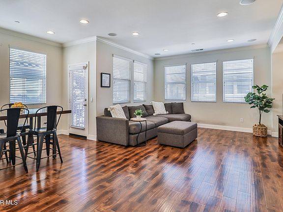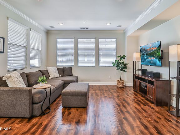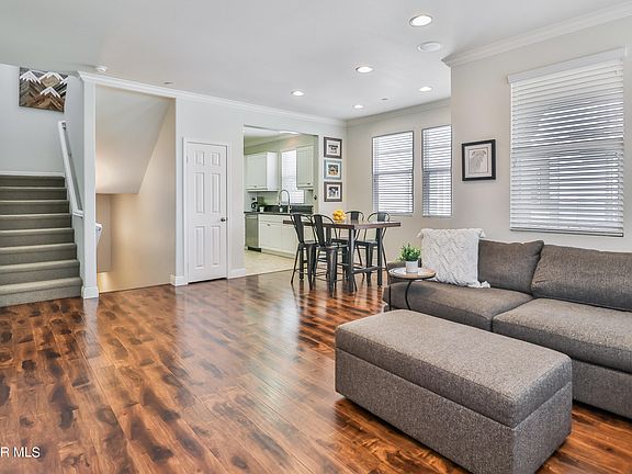 Spacious two-bedroom, two-bathroom Riverpark townhome welcomes all with its open floor plan, hardwood floors, and recessed lighting throughout while swaths of natural light give this home warmth and appeal. Entertain with ease in the spacious main living room with its surround sound system and open concept dining room. Grill or relax with a good book on the adjacent balcony. The bright, white kitchen offers stainless steel appliances, granite countertops, and ample cabinetry. Main floor bedroom is nicely sized with a full bathroom that includes a tub/shower combination. Full size laundry. Retreat upstairs to the private primary bedroom on its own floor with a large closet and a beautifully appointed bathroom with updated oversized glass shower and generous dual sink vanity. Attached two car tandem garage with overhead storage shelves. Whole house water filter system. Close to incredible shopping and dining (The Collection is nearby) with easy access to freeways, the beach and the marina, this location cannot be beat and in a charming neighborhood. It's your next home - move right in and enjoy the cool Oxnard breezes!