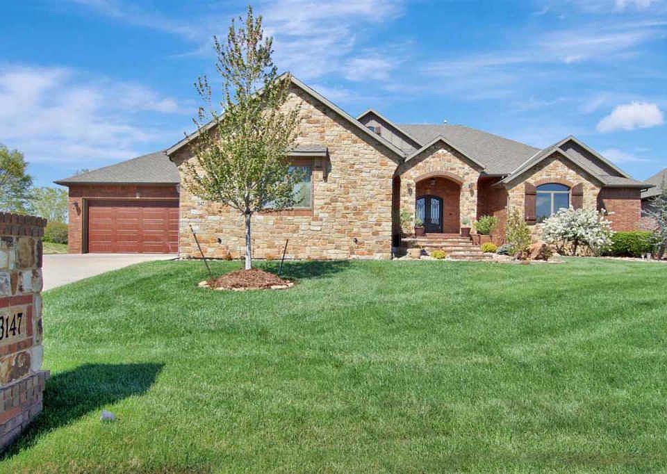 3147 N. Den Hollow in Fox Ridge Estates and Maize south school district. Custom built, full brick and stone with great attention to detail. Large gourmet kitchen with 6 foot granite island to seat five with ease, 6 burner gas Viking range with hood that vents to the outdoors,large Blanco Sink and prep sink,HUGE pantry with countertop for prepping and small appliances, all open to dining room with huge windows and barrel ceiling with beams. Hand scraped hardwood floors in entry, dining room and kitchen. Living room has oversized gas fireplace, iron accents in transom windows and is framed in true stone with wood beams. Entry from the garage features half bath and separate room for office and plenty of space in the drop zone. Spacious covered composite deck is protected on three sides, has car siding on the ceiling and can be accessed from the dining room or master bedroom. Master bath boasts huge custom tile shower, seated vanity area, abundance of cabinets including cabinets on granite counters with outlets inside. Master closet is oversized and next to the laundry room with Blanco sink, laundry sorters and built in ironing board (separate room) Two additional main floor bedrooms are split by a full bath with seated vanity. Plumbed for additional washer dryer. Central vacuum for your convenience. Basement wet bar is a full kitchen, beautiful custom tile, overlooks theater space. Two full baths in the basement and multiple flex rooms. Game room, workout room, guestroom⦠Walkout basement with two walkout pits.OVERSIZED SIX CAR GARAGE!! The area under the OVERSIZED SIX CAR GARAGE is mostly finished and could be used as you see fit⦠Office, home business, workout suite, crafting, mancave, play area, shop. There is access from the garage directly to this space as well as two doors to access the outdoors. IR class 4 roof may offer insurance discount. 4 zone heating and air, two 50 gallon water tanks, sprinkler with well, 400 amp electric service and 2 Tesla charging outlets. This home offers so much flexibility and checks all the boxes!! NO SPECIALS! You will truly enjoy your privacy on this birm lot. 2 pools in the neighborhood, one has a kiddie pool and lifeguards at all times for your added safety. awesome walking paths throughout that border native landscape, such a well thought out neighborhood. Minutes from all the best shopping and restaurants of New Market Square. This is a must see. Schedule your private showing today. Schedule your private showing today.