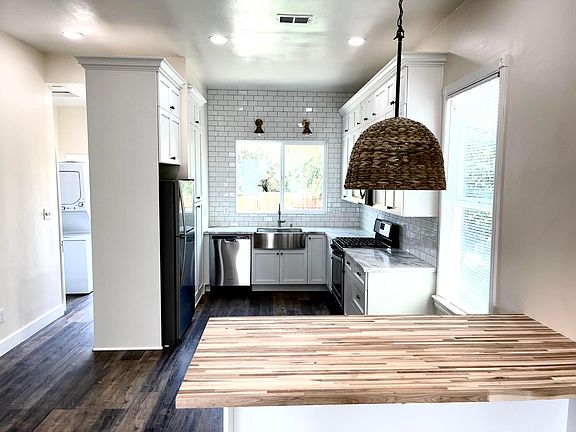 This house has 2 spacious bedrooms and 1 bathroom. Interior has been newly renovated and updated throughout with 10 foot ceilings. Laundry hookups and a stackable washer / dryer included. The house has a brand new HVAC system, hot water heater, brand new vinyl flooring and baseboards throughout, recessed lighting throughout with modern light fixtures in the bedrooms. Kitchen is newly updated with brand new appliances (refrigerator, dishwasher, oven/stove, and built-in microwave), quartz countertops, custom cabinets, with full extension drawers and soft close doors, and even a lazy susan!