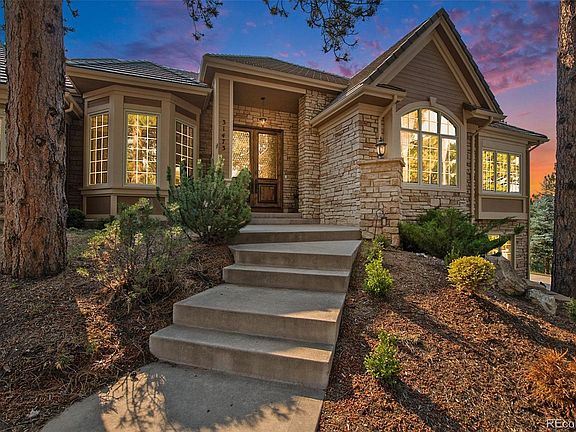 Live in a distinguished gated Evergreen community in an exceptional ranch walkout home backing to open space. The designer kitchen features quartzite natural stone countertops, a Wolf gas cooktop with custom range hood, Viking double oven, stainless steel refrigerator, and custom lighting. The primary bedroom boasts a walk-in closet and luxurious ensuite bath with quartzite natural stone counters, jetted tub, shower, and dual vanities. Every detail of this home exudes luxury, from the stone, hardwood, and plush carpeted floors to the custom bath fixtures. The lower level offers a bar with mini-fridge and sink, entertainment area, and walk-out access to the backyard with Bergen Peak views. Your new home is convenient to open spaces, shopping, dining, and Evergreen activities. Entering through grand glass double doors, you'll notice comprehensive updates, including newer windows, interior doors, flooring, woodwork, custom beams, fireplaces, ironwork and rails, lighting, motorized blinds, and newer furnaces. Your home features a fenced backyard with three gates, a hot tub, Generac natural gas-powered electric generator, and playset. Listing Agent is also the seller. Xfinity high-speed internet is connected, ensuring you stay well-connected in this luxurious Evergreen retreat.