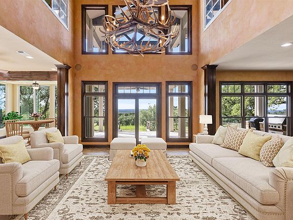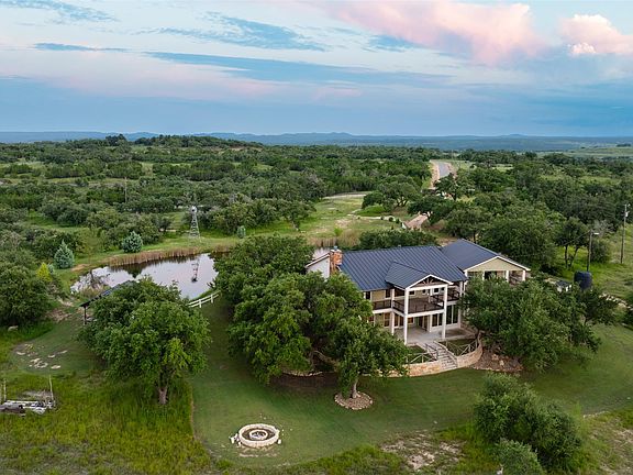 Experience luxurious Hill Country living at this 25-acre estate within gated Byrd Ranch Estates in Eastern Blanco County. Accessed by a picturesque bridge over Miller Creek, this private haven blends scenic beauty with opulent spaces. The property is cedar-cleared and high-fenced, with land sloping to reveal stunning northern views. Dominant hardwoods include live oak and Spanish oak. The lined, irrigated pond holds water year-round for bass and catfish. A water well services the property, and a rainwater collection system could be added. The property is high game fenced and ready to support just about any type of wildlife including exotics, horses and cattle. The main house features an open floor plan with a spacious kitchen, large dining area, and great room with a fireplace. A cigar and cordial room has antique windows and ports from an old ship. Giant ceilings lead to an upstairs bedroom, a game area with an additional fireplace, and an office or second bedroom. The guest house, connected by a covered walkway, includes four bedrooms, two baths, and a community living area. Multiple porches, patios, and sitting areas adorn all structures, and an attached multi-bay garage adds convenience. The outdoor area features a BBQ, a pavilion overlooking the pond, and a fire pit ring. The pond supports bass and catfish for fishing, and the hardwood cover attracts local wildlife. Conveniently located in the Texas Hill Country near Austin, San Antonio, Dripping Springs, Blanco, Johnson City, and Fredericksburg, this estate is ideal for family gatherings, entertaining, and enjoying the Hill Country.