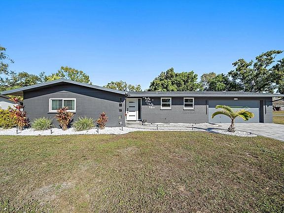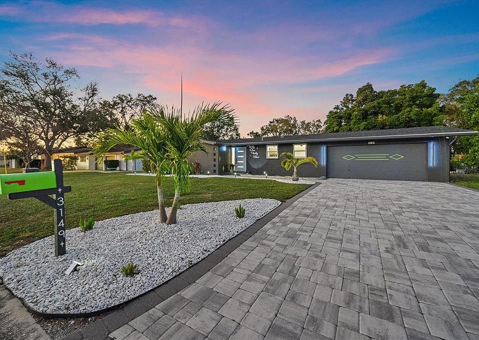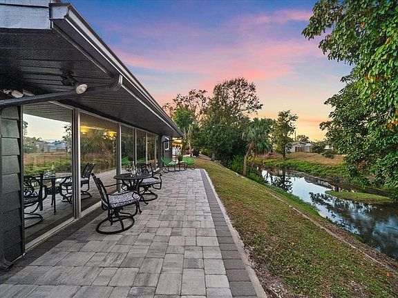 Mid-century inspired architecture paired with a complete modern renovation, set along a tranquil creek that offers a peaceful waterfront backdrop with a unique elevated setting. Positioned high above the water, the home enjoys serene views, with frequent wildlife sightings from both inside and out. Recent improvements include a new roof, hurricane-rated windows, designer lighting, and all new large-format tile flooring throughout. A dramatic step-down living area adds architectural character, while the custom kitchen remodel features high-end KitchenAid appliances and bar seating ideal for entertaining. Two spacious bedrooms include walk-in closets, and the expansive Florida room—finished with upgraded window tint—serves as a versatile flex space that could easily accommodate a Murphy bed. The home offers two beautifully updated bathrooms, including a hall bath with a separate tub and walk-in shower, and a well-appointed primary bath with a large walk in shower and bench. Situated on a 10,000+ sq ft oversized corner lot, the property features a new paver driveway, extended patio, and a generous side yard that could accommodate a future pool or expanded outdoor living space. Mature trees create a natural backdrop behind the home, enhancing the peaceful water setting. Despite its waterfront location, the home sits high above sea level, has never flooded, and has withstood hurricanes. The garage is enhanced with a newly installed Shark Floor coating, providing a durable, sleek, and easy-to-maintain finish. Enjoy tranquil outdoor living with water behind the home, where you’ll regularly spot fish, turtles, and a variety of birds in your own private nature retreat. Not located in a flood zone, and with no HOA or CDD fees, this move-in-ready property offers freedom, flexibility, and peace of mind. Located in the highly desired Southgate Neighborhood. Conveniently located minutes to downtown Sarasota, approximately 10 minutes to Siesta Key Beach, and between two top-rated hospitals. Turn-key, move-in ready, and truly one of a kind.
