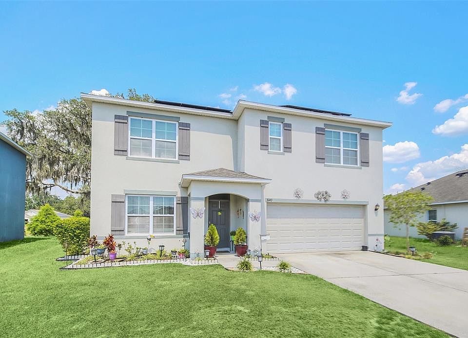 This stunning 5-bedroom, 3-bath home in the GATED community of Sereno offers the perfect blend of space, style, and seclusion. With 2600+ square feet of living space, the property features an open concept design, with a modern kitchen overlooking the dining and living room areas. The first floor boasts a front room for an office, playroom, or traditional Entry room.There is also a FIRST FLOOR BEDROOM with a FULL BATHROOM. The second floor features an expansive primary bedroom with en-suite master bath, as well as three additional bedrooms surrounding a second living area, or loft. The private backyard offers a peaceful view of the pond and preservation area, with no rear neighbors, making it the perfect retreat. The neighborhood has 2 COMMUNITY POOLS and a PLAYGROUND! With its convenient location close to theme parks, restaurants, shopping, and easy access to I-4, this beautiful home is a must-see.