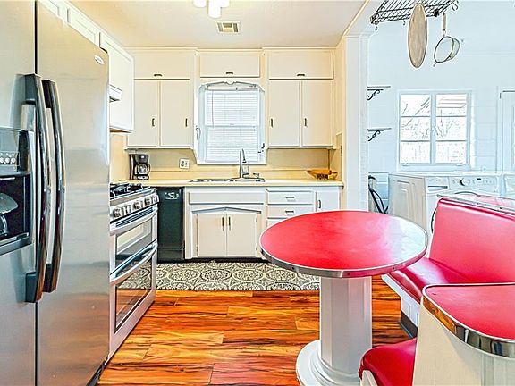 You'll be proud of this Park Place address. A few modern touches include luxurious light fixtures, an upgraded double oven gas stove and plush carpeting that covers original WOOD FLOORS. The two living areas are spacious and perfect for entertaining. The back living room is lined with windows full of natural light. It has interior washer/dryer hookup and a large storage closet. The formal living area has floor to ceiling built in bookshelf. The kitchen has an eat in nook with attached bar. The vintage built in table and red seating is in great condition and sure to be conversation when your guests arrive. The covered back porch is large and perfect for sipping a cup of coffee. Mechanical upgrades include new roof in 2013, hot water heater 2012 and whole house plumbing 2005. Attached one car garage and one car port.