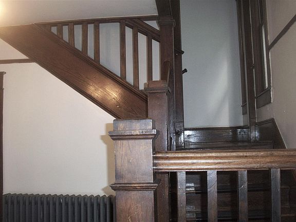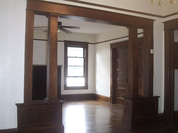 This property was a mansion when built in 1921. It is a stately brick with a beautiful welcoming foyer, large living room with fire place and leaded glass window looking onto the street, dining room with a bank of 3 windows and a fabulous stained glass window. 4 BRs all on second floor. Very stately double staircases. The original 2 inch oak flooring remains in very good shape, oak woodwork is still present with 8 inch baseboard-none have ever been painted. There is a set of lovely pocket doors that separate LR from DR. The full bath and half bath could use upgrades. The kitchen has cabinets, stove and microwave at time of listing. Refrigerator to be added. Some of the older light fixtures remain and some newer have been add