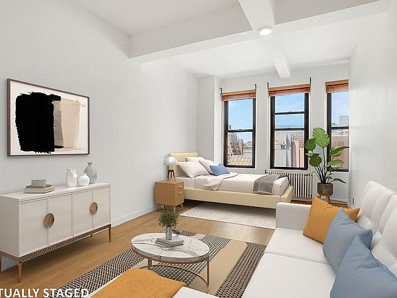This prewar residence features soaring ceilings, oversized west-facing windows, and abundant natural light throughout the day. The open layout offers a flexible living and sleeping area, complemented by a walk-in closet that provides excellent storage.