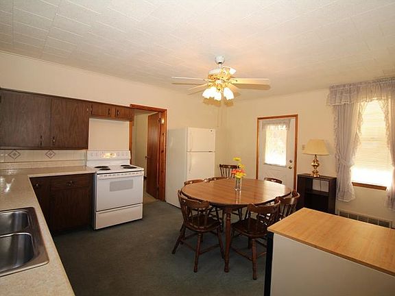 Spacious 3 Bedrm in Absolute Move-in Condition! Convenient 1st Floor Master w/ Powder Rm, Deep Walk-in Closet plus 7x14 Den! Very nice carpeting covering Hardwd Flrs in both LivRm w/ Coat Closet and bigger BedRm upstairs w/ 2 closets. Very Well Constructed w/ Plaster Walls & Beautiful Wood Trim & Doors. HUGE Eat-in Kitn w/ plenty of Nice Cabinetry, Ceramic Tile Backsplash, Ceiling Fan Light & Deep, Shelved Pantry Closet. Ceramic Tile around Tub, Newer Vanity & Deep Linen Closet in Full Bath. Unique room off Bath leads to 8x8 addtl rm w/ Built-in Shelving which could be a Massive Closet / Changing Rm, Sewing Rm, Art Room, Storage, ect... Large Lower Level w/ Game Rm offering a Wood Stove that could stay (needs connected, Decorative). Big Workshop Room in Back. Convenient door to Fenced Side Yard & Great Covd Patio. Also offers Covd Front Porch off LivRm! Newer 150AMP electric service, Roof 2014, Hot Water Tank 2016. 2 Blocks frm Busline & Library. Close to Park, Restaurants, shopping