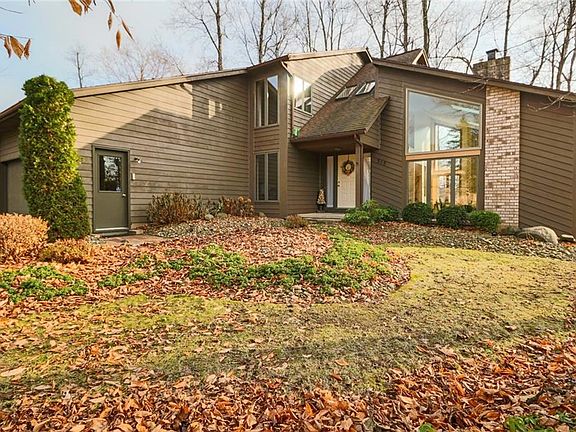 Wonderful 2,310 square foot contemporary colonial on a beautiful wooded lot. Home offers volume ceilings, skylights, walls of windows and a wide open floor plan. The kitchen is eat in and also has an oversized island with breakfast bar. Off the kitchen is a beautiful sunroom which is heated by a gas fireplace and opens to a private deck. The formal dining room opens to the great room with soaring ceilings and a wood burning fireplace. There is a first floor office/den, powder room and laundry. The lower level is finished with a wet bar, full bath and a large living space. There is also a workshop and plenty of storage space.