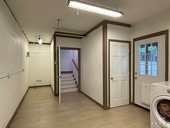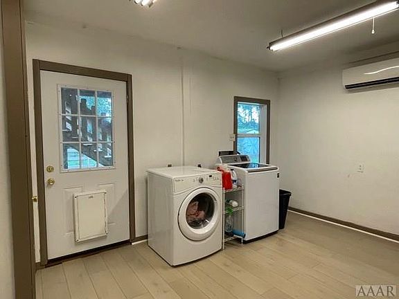 UNIQUE BARN STYLE HOME IN TRANQUIL AREA OF MOYOCK. 1ST LEVEL IS 2-4 CAR GARAGE/WORKSHOP WITH MUD ROOM IN REAR, POSSIBILITY TO ADD ANOTHER BATH DOWN. UPSTAIRS YOU WILL FIND LIVING ROOM WITH ACCESS TO DINING/KITCHEN AREA AND FRENCH DOORS TO HUGE REAR DECK, WITH STAIRS TO REAR YARD. DOWN THE HALL WAY THERE IS A LARGE HALL BATH ROOM W/ DUAL ACCESS TO PRIMARY BEDROOM THAT HAS SLIDERS TO FRONT DECK FOR YOUR RELAXING MORNING COFFEE SIPPING PLEASURE. WORKSHOP/SHED WITH POWER. BANANA TREES & GREENERY MAKE YOU FEEL LIKE YOU ARE IN THE TROPICS. CALL TODAY TO SEE & ENJOY.