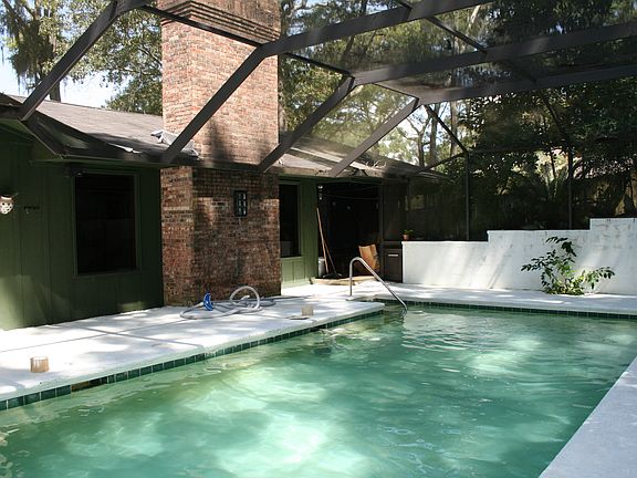 This expansive and unique home with cypress board and baton exterior includes a 15-x-30 in-ground pool, which can be heated and is totally covered by a screened canopy. Living room and master bedroom have cathedral ceilings and fireplaces. Dining room has large wet bar with refrigerator. Large kitchen with abundant storage and center island opens to dining and den. Split bedroom plan, central vacuum system. Deeded (1/26th) neighborhood bayfront access. Irrigation system. Both HVAC systems new within the past year or so. Central vacuum system. Sound system throughout the home with speakers in some bedrooms and common areas. Storage building and high-yield orange tree in the back yard. Qualified buyers only; must be prepared to provide proof of cash or pre-qualification for financing before scheduling a showing. APPOINTMENT REQUIRED.
