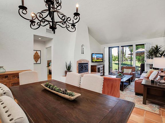 Welcome to The Lakes Country Club! From the moment you walk into the lush courtyard, with market lights and a tranquil water feature, you will feel relaxed and welcomed. This charming, Adobe -styled 2 Bed, 2 Bath home is FULLY equipped to enjoy the fabulous Desert Lifestyle. The Saltillo paver flooring, crisp white walls and chimney style fireplace create a festive feel to this light, bright gem. Quality contemporary furnishings accented with antique Spanish collectables create an inviting space for relaxing and entertaining. Enjoy the privacy enhanced, South facing patio with outdoor dining and living space - the mountain views are stunning! This home overlooks a double fairway with pool and spa close by. The garage is decked out with custom organizers for plenty of storage, a mini-split and epoxy garage floors. The Lakes Country Club offers a robust schedule for social and fitness activities at the new Clubhouse and sensational Health and Wellness Center. Enjoy Tennis, Pickleball or Pop Tennis, Bocce or the 44 community pools and spas. For golfers, the Club offers membership options for the 27 hole championship golf course designed by Ted Robinson. A move-in-ready home that has so much character and charm is rare, schedule a tour so that you can start enjoying The Lakes Lifestyle!