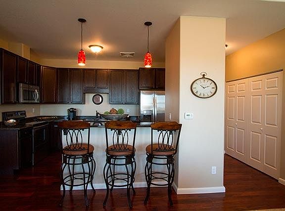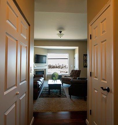 This is a 2-bedroom, 2-bath apartment home located on the *2nd floor overlooking the Tongue River, with 1,100 square feet of living space and 200 square feet of balcony space. The kitchen appliances are stainless steel, and the cabinets are wood with an ebony black finish. Included appliances are: dishwasher, range, over-the-counter microwave, garbage disposer, refrigerator, washer and dryer. The kitchen also includes a granite-top island. One of the two bathrooms has a walk-in, tiled shower. This unit also has a fireplace in the corner of the living room. The ceilings are 8 & 9 high. The flooring is: hardwood and carpet throughout, bathroom floors are tiled. Upgraded with: Walk-in Tiled Showers, Gas Fireplaces, Stainless Steel Appliances, Granite-Topped Kitchen Island and Wood Floors.