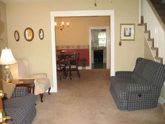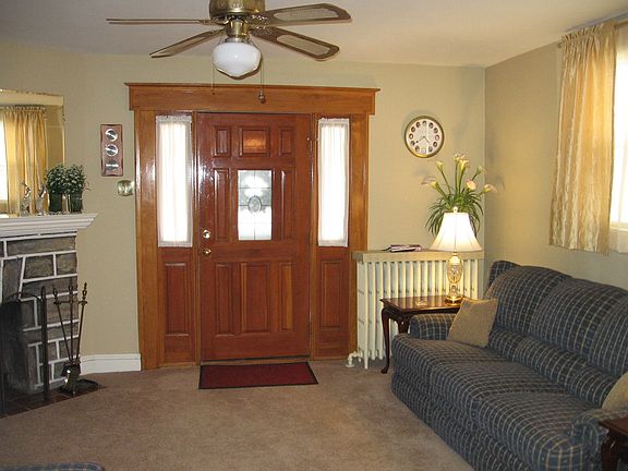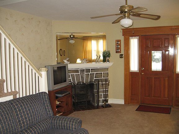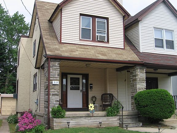 This lovely home has a welcoming covered front porch to enjoy before entering into the spacious living room which has a great stone wood burning fireplace, ceiling fan and wall to wall carpeting that leads into the formal dining room with chandelier and a unique alcove. Enjoy cooking in this eat-in kitchen which has a dishwasher, gas oven plenty of cabinetry and an outside exit to a cozy deck, a great back yard and detached garage. The second floor offers a large master bedroom with ceiling fan, two additional good sized bedrooms and a hall bath and linen closet. The living space continues into the spacious finished basement/family with a powder room and separate utility/laundry area - note there is also outside access from the basement. This home has been well taken care of and is conveniently located near public transportation, schools and shopping