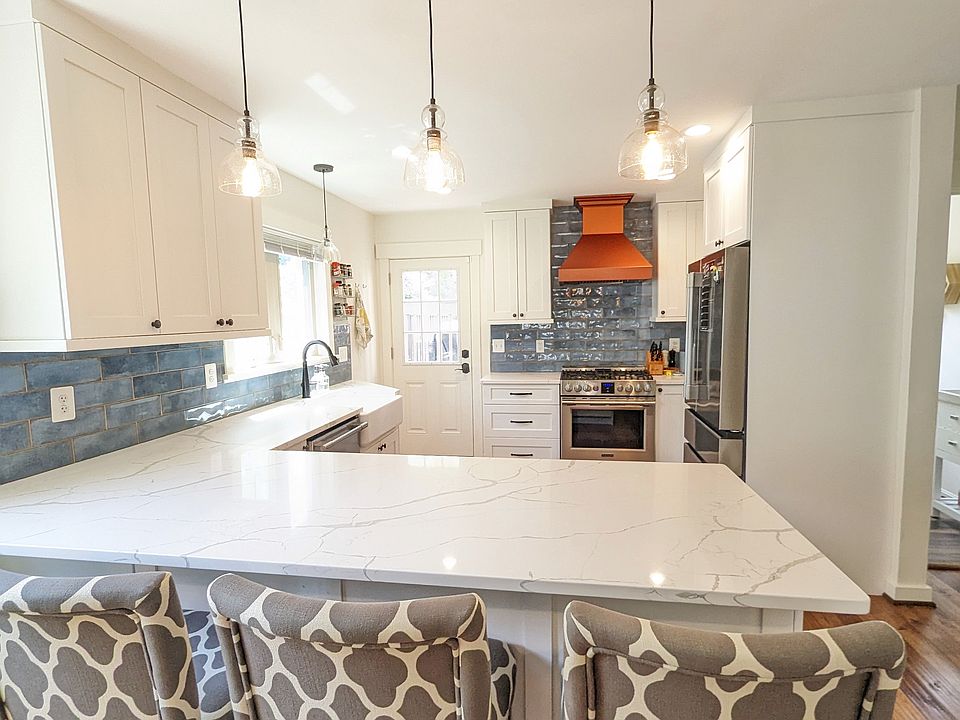 Step inside to discover a stunning open floor plan that seamlessly combines style and functionality. The gorgeous kitchen is a chef's delight, featuring a striking copper hood, pristine white shaker cabinets, and luxurious quartz countertops. The expansive peninsula offers seating for four, making it the perfect spot for casual meals and entertaining. The main floor also boasts a rare half bathroom, adding convenience and a touch of luxury.