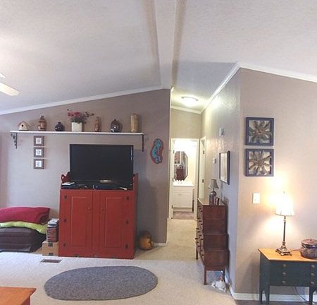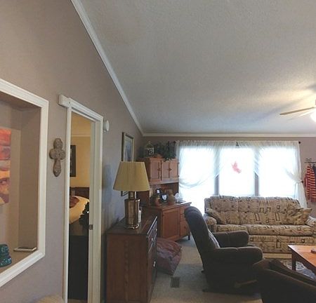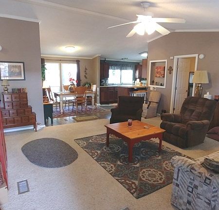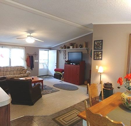 Really nice and well maintained Palm Harbor home. Split bedroom floor plan with a large inviting master suite. High ceilings and rich colors throughout with a real open feel. Pride of ownership will be obvious and it shows like a dream! Enjoy two covered decks, along with a carport and extra parking. Other improvements include: 24'x24' detached garage on a cement slab, and 12'x12' storage shed or workshop. Serene and peaceful (large lot) with lot of wildlife. Home features refrigerated air, metal roof, all village utilities and meets village compliance. Being sold with all appliances and some furniture negotiable outside of closing. Charming property!