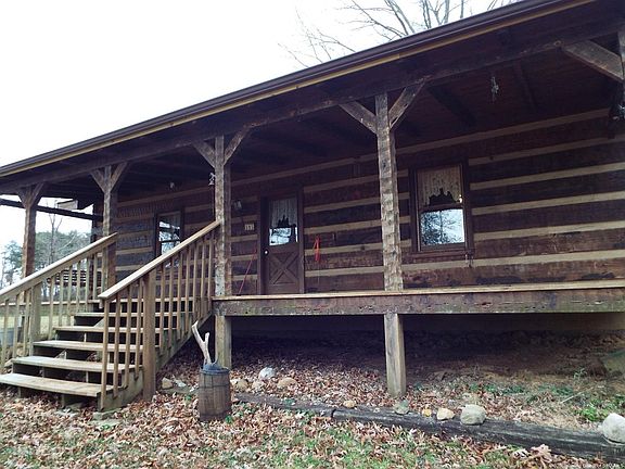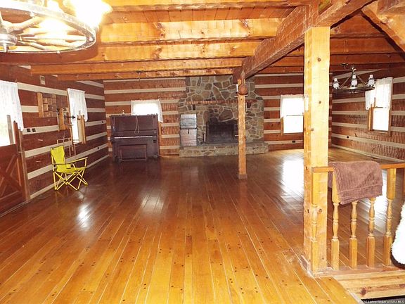 Cozy rustic log home on 2 acres with an unfinished walk-out/ drive in 1 car basement. Main floor is all open with floor to ceiling field stone fireplace(also in basement) pegged oak hardwood. Ceiling open to upper loft. Large country kitchen and dining area. The hand hewed staircase goes up to open loft with 1 possibly 2 bedrooms with knotty pine floor. Exposed ceiling beams. Beautiful large covered front porch and deck on back. Access to home is by permanent easement, does not include the barn. There is road frontage to side of home to add a drive. Records show built in 1973 but was for a previous home, original owners family states that home was built in 1992. Being sold as is but inspections welcome. Owner has not lived on the property.