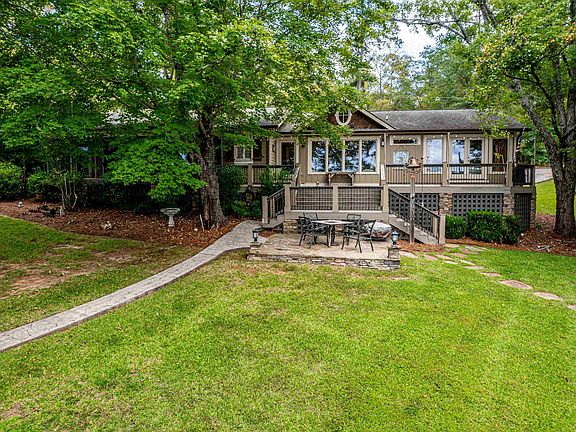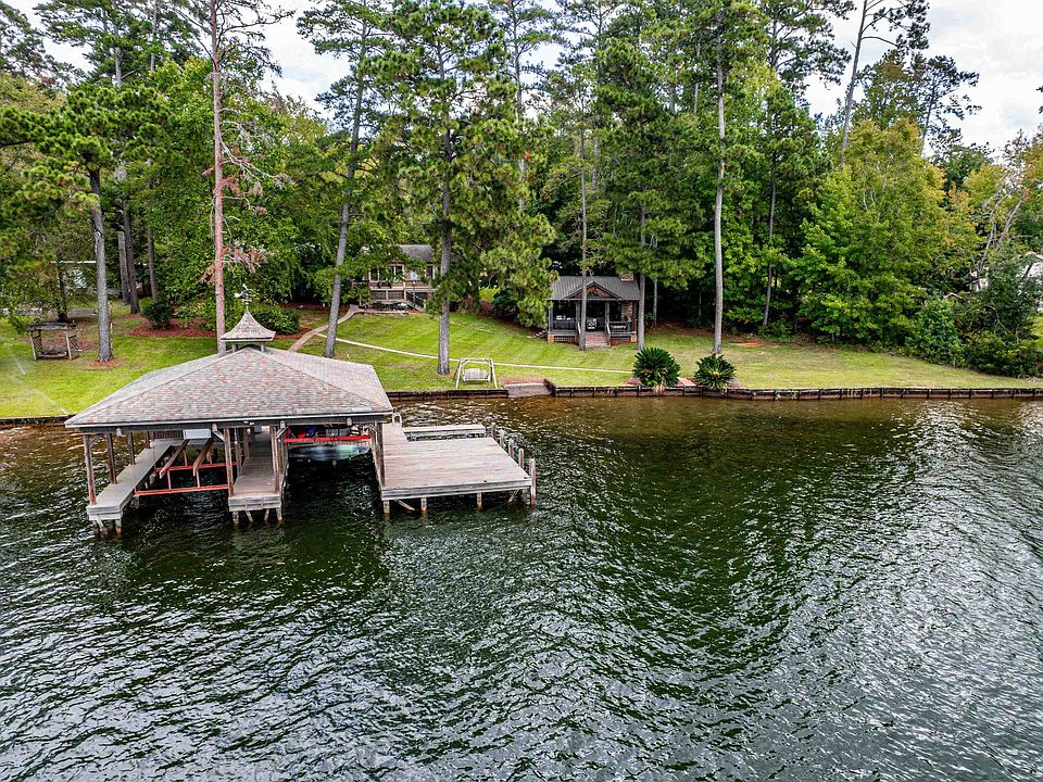 Stunning one-level lakefront home on a beautiful private 1.37-acre lot on Lake Sinclair with renovations completed in 2014 that doubled the size of the home. Featuring 5 bedrooms plus a bonus room that could be used for storage or as an additional bedroom. There are 4 full bathrooms with two of the bathrooms as ensuites. Gorgeous pine vaulted ceilings are featured in the dining room and main primary bedroom with pine beam ceilings in three of the secondary bedrooms. The spacious layout is perfect for family and guests. The open living and dining area offers 10-foot ceilings, a stone fireplace, and floor-to-ceiling windows with sweeping lake views. Floor to ceiling built in bookcases in the living room and one primary bedroom. The kitchen includes a 9-foot island and a walk-in pantry for all of your family gatherings. Enjoy outdoor living with a screened porch, an open deck with beautiful lake views of deep, clear water. The is a max dock with two boat slips with electric lifts and a dedicated space for jet skis. The water is 7-8 feet at the end of the dock with good water clarity. With 216 feet of waterfront, this property delivers the best of Lake Sinclair living. A cornerstone feature is a stunning 18x24 pavilion with metal roof built from 12x12 posts and beams from the Terminal Station in Macon. It is fully equipped for entertainment with a sink with running water, a wood burning fireplace, TV, grill, smoker, stone countertops, two small refrigerators, and plenty of storage.